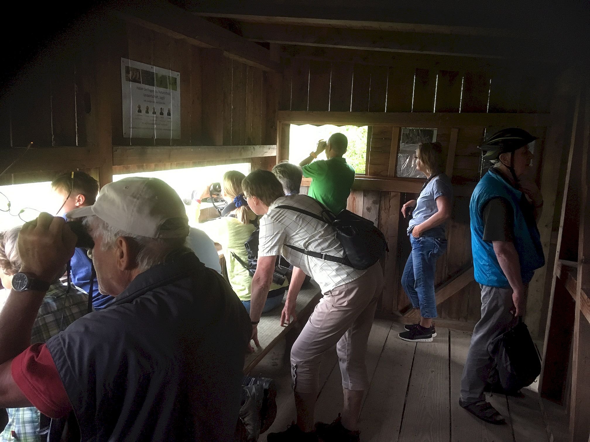 Als wir in Weetzen ankamen hatten wir Glück. Der Kuckuck rief lautstark, die Störche fütterten gerade ihre drei Junge, der Eisvogel flog zur Begrüßung einige Runden vor der Beobachtungshütte. Neben den Wasserbüffeln konnten auch verschiedene Gänse-, Enten- und Reiherarten beobachtet werden.