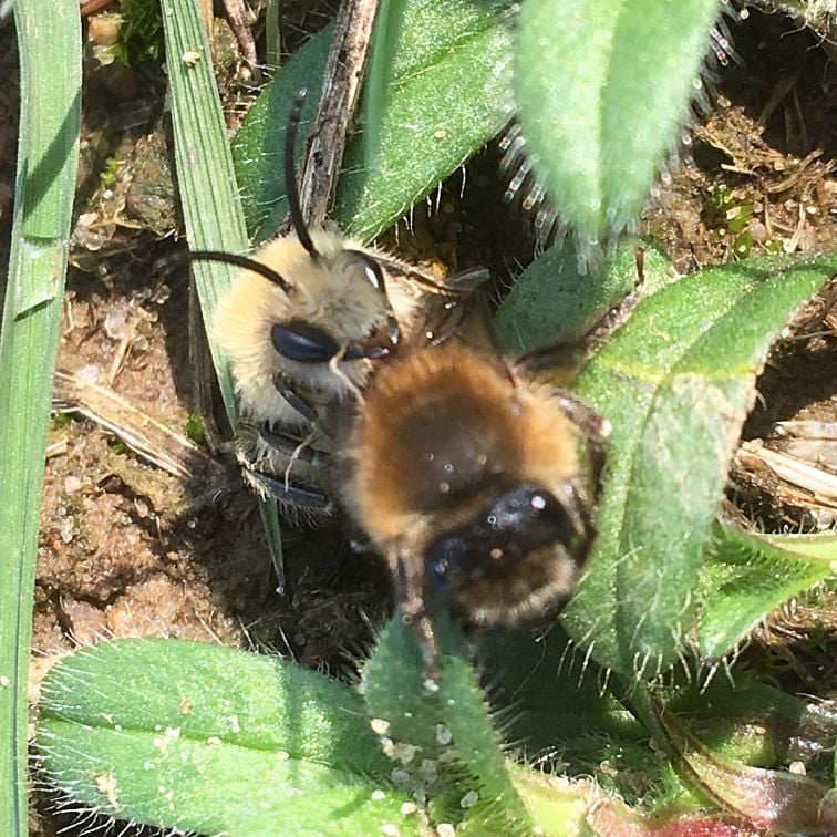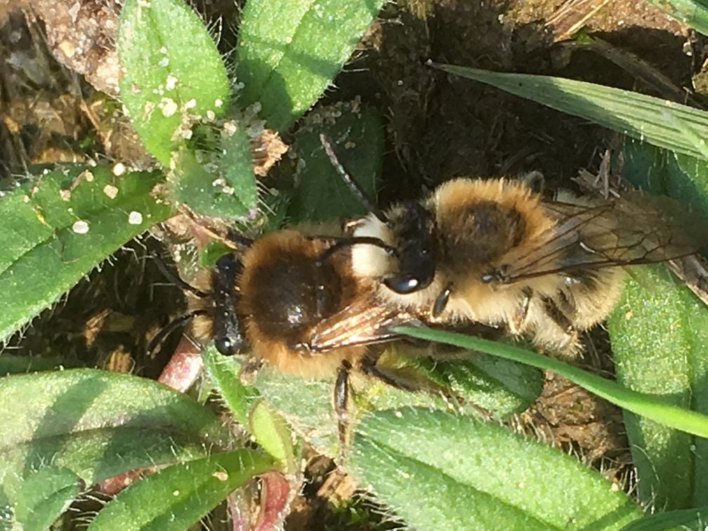 Hier handelt sich um die Frühlings-Seidenbiene (Colletes cunicularius). Der dichte "Bart" und die buschige Behaarung (frontal gesehen) sind bei den Männchen gute Erkennungsmerkmale! Die Nester werden bevorzugt auf waagerechten Flächen im lockeren Sandboden, häufig in großen Kolonien angelegt. Pollen und Nektar werden bevorzugt von Weiden (Salix) gesammelt. Die Überwinterung findet als bereits fertig entwickeltes Insekt innerhalb der Brutzelle statt.