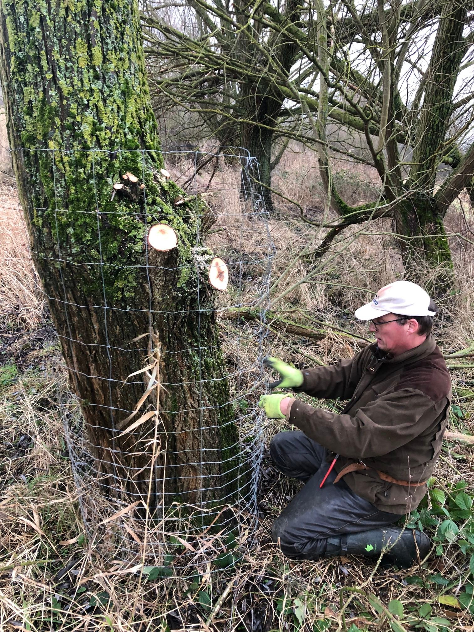 Foto 5: Anbringen eines Drahtgeflechts zum Schutz eines Eichenbaums