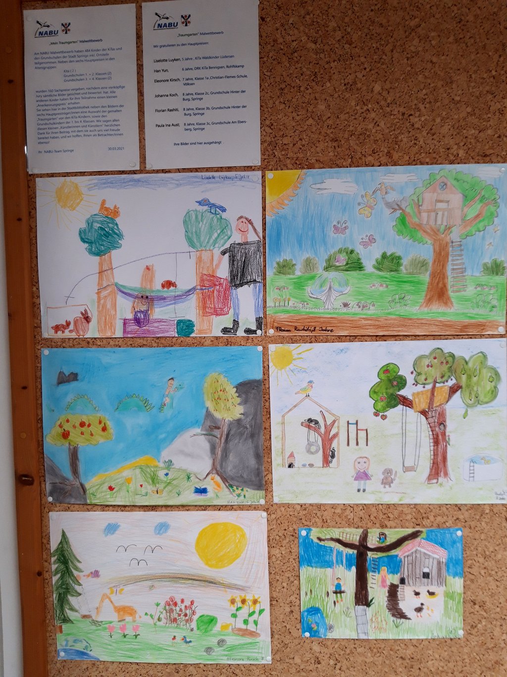 Die im Rahmen des Kindermalwettbewerbs „Mein Traumgarten“ eingereichten Bilder sind nur noch bis zum 21.05. in der Springer Stadtbibliothek während der bekannten Öffnungszeiten zu sehen. Danach werden die über 100 dort aufgehängten Bilder der Preisträger/-innen über die betreffenden Schulen und KiTas an die Teilnehmer/-innen zurückgegeben. 484 Kinder hatten sich an dem Wettbewerb beteiligt, über 160 wurden mit naturbezogenen Sachpreisen ausgezeichnet, alle anderen mit kleinen Anerkennungspreisen für ihre Teilnahme belohnt.