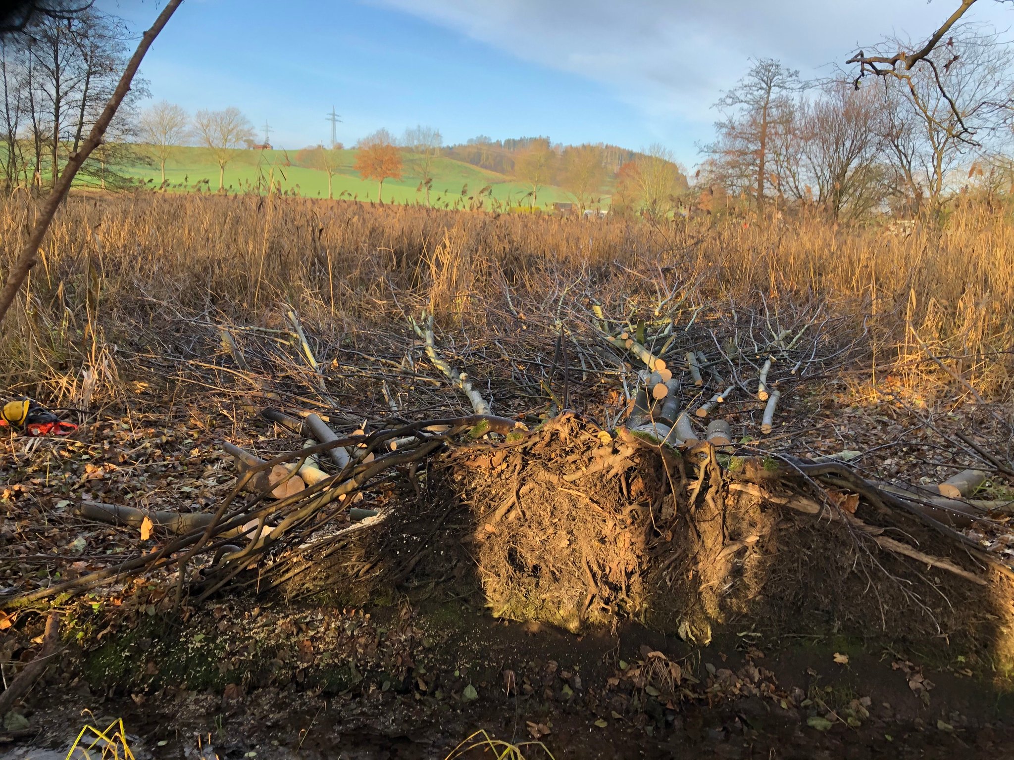Nach dem abgestimmten Maßnahmenplan wurden 15 große Erlen gefällt, und das Holz wurde per Hand in dem anliegenden Wald gezogen und als sog. Totholzhaufen aufge-schichtet. Diese Arbeiten müssen regelmäßig wiederholt werden, um der Sukzession vorzubeugen und dem Lebensraum „Schilfröhrich“ zu erhalten.