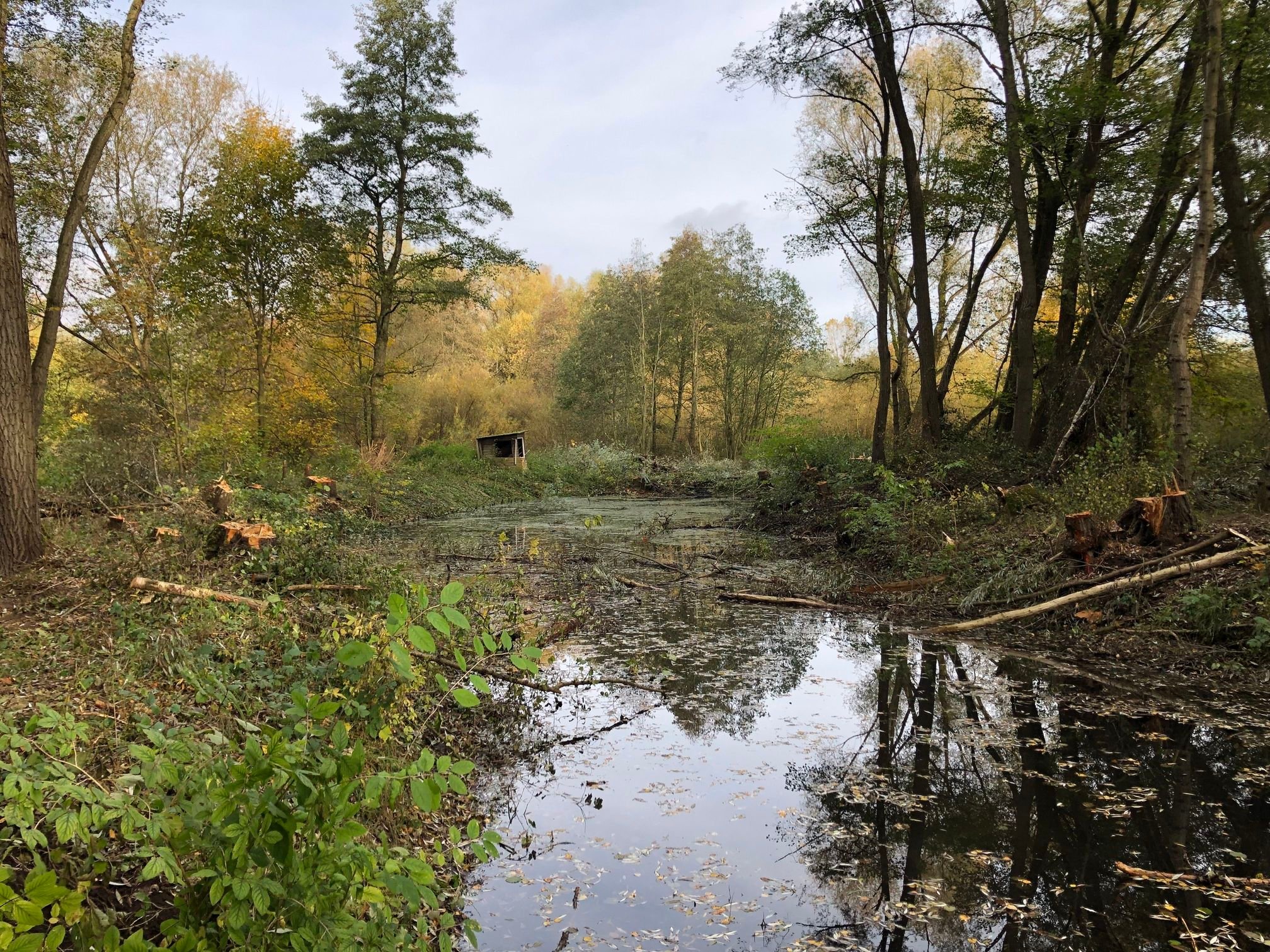 Außerdem wurde eine umgestürzte Weide entfernt und eine zweite Weide als Kopfweide geschneitelt. So kommt wieder mehr Licht auf die Wasserfläche und es gelangt im Herbst weniger Laub in das Wasser. Das Schnittgut wurde zu einem neuen Totholzhaufen aufgeschichtet, um einen zusätzlichen Lebensraum bzw. Unterschlupfmöglichkeiten für Vögel und Amphibien zu schaffen.